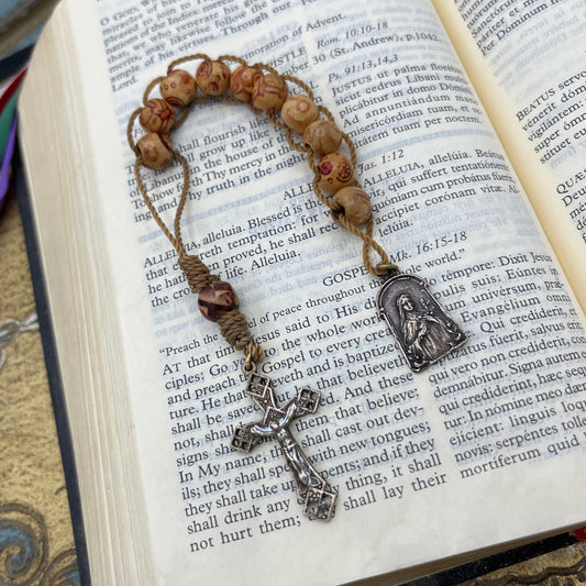 Sacrifice Beads Sliding Rosary Tenner – Good Deed Beads with Cream wood beads Bronze Crucifix & St. Thérèse Medal